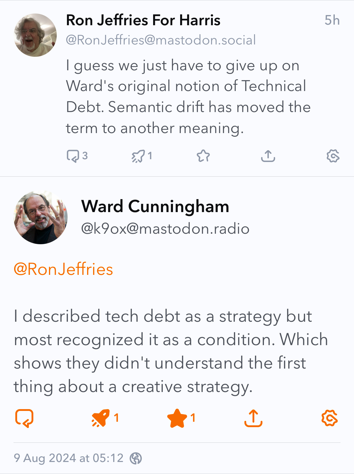 Today, while hanging out in Mastodon (as I do when I am having my morning coffee), I came across a post from Ron Jeffries (and Ward Cunningham’s answer to it – there were more people commenting though).